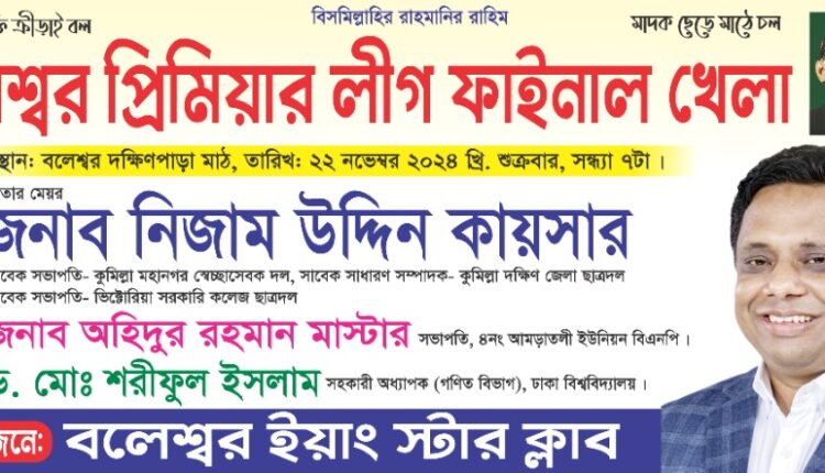 শুক্রবার সন্ধ্যা সাতটায় কুমিল্লা সদর উপজেলার বলেশ্বর গ্রামে প্রিমিয়ার লিগ ফাইনাল খেলা অনুষ্ঠিত হবে। খেলার অংশগ্রহণ করবে বলেশ্বর টাইগার বনাম বলেশ্বর হিট।