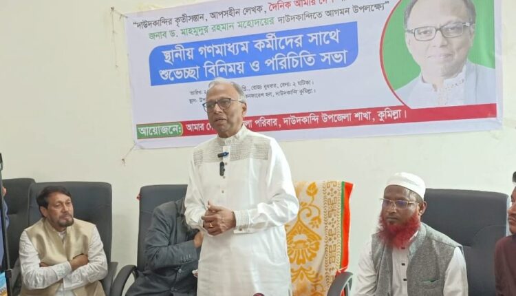 দৈনিক আমার দেশ পত্রিকার সম্পাদক ও কুমিল্লা দাউদকান্দির সন্তান ড. মাহমুদুর রহমান বলেছেন, আমি যে লড়াইটা করছি, এটা আপনাদের জন্য, মিডিয়ার জন্যই। লড়াই করছি বাংলাদেশের স্বাধীনতা ও সংবাদ মাধ্যমের স্বাধীনতার জন্য। এ লড়াইটা যেন চালিয়ে যেতে পারি এবং আপনাদেরকে সাথে নিয়েই। তিনি বলেন, আমি দাউদকান্দির সন্তান। আপনারা আমার জন্য দোয়া করবেন। আপনারা আমার পাশে থাকবেন। তিনি বুধবার দুপুরে তার নিজ বাড়ি দাউদকান্দির বাউরিয়া গ্রামে যাওয়ার পথে দাউদকান্দি মডেল মসজিদ কনফারেন্স হলে স্থানীয় গণমাধ্যম কর্মীদের সাথে শুভেচ্ছা বিনিময় ও পরিচিতি সভায় বক্তব্যে এসব কথা বলেন। তিনি আরো বলেন, দাউদকান্দি আমার জায়গা, নিজের বাড়ি, নিজের গ্রাম। এইবার বিদেশ থেকে এসে ৩ মাসের মধ্যে বাড়ি আসতে পারিনি। আজকে আসছি, আমার আব্বা, দাদা-দাদি ও ভাই আল্লাহর কাছে চলে গেছেন। তাদের কবর জিয়ারত করতে আসছি। আমার আম্মা এখানে হাসানপুর কলেজে দীর্ঘদিন শিক্ষকতা করেছেন। এখানে আম্মার ছাত্র থাকতে পারেন। আমাদের জন্য সবাই দোয়া করবেন। এসময় উপস্থিত ছিলেন, বাংলাদেশ সংবাদপত্র এজেন্ট এসোসিয়েশনের সাংগঠনিক সম্পাদক মোহাম্মদ আলী, আমার দেশ পাঠকমেলার দাউদকান্দির সভাপতি মোখতার হোসেন ও সাধারণ সম্পাদক তৌফিক রুবেল প্রমুখ।