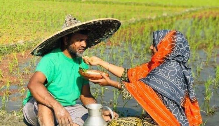 বাড়ির পাশে সবুজ মাঠ। সেখানে ভোর থেকে ধানের জমির কাদায় নেমে আগাছা পরিষ্কার করছেন স্বামী। স্ত্রী খাবার নিয়ে এসেছেন। হাতে কাদা থাকায় স্বামীকে মুখে তুলে খাইয়ে দিচ্ছেন। এছাড়া স্বামী স্ত্রী মিলে গরুর খামারের গোবর পরিষ্কার করেছন। এটা আবহমান বাংলার চিরায়ত রূপ। তবে এই দম্পতির গল্প ভিন্ন।