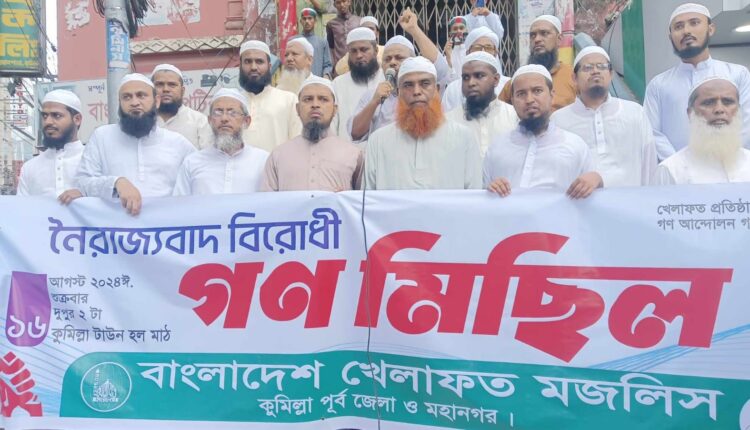 বাংলাদেশ খেলাফত মজলিস কেন্দ্র ঘোষিত নৈরাজ্যবাদ বিরোধী গণ মিছিল আজ শুক্রবার বাদ জুমা কুমিল্লা টাউন হল ময়দান থেকে শুরু হয়ে শহরের গুরুত্বপূর্ণ সড়কে প্রদক্ষিণ করে। মিছিল শেষে আলোচনা সভা অুষ্ঠিত হয়। বক্তব্য রাখেন বাংলাদেশ খেলাফত মজলিস কুমিল্লা মহানগরীর সাংগঠনিক সম্পাদক হাফেজ মাওলানা অলিউল্লাহ, সহকারি সেক্রেটারি মাওলানা শরিফ আশরাফী,মাওলানা সালাউদ্দিন কিবরিয়া, সহ-সভাপতি মাওলানা আমানুল্লাহ মুন্সী, মুফতি আবুল বাশার, মহানগর সেক্রেটারি মুফতি ইমাম হোসাইন, মহানগর সভাপতি হাফেজ মাওলানা সুলাইমান, কুমিল্লা পূর্ব জেলার সেক্রেটারি মাওলানা মনিরুল ইসলাম কাসেমী। দোয়া পরিচালনা করেন হাফেজ মাওলানা অলিউল্লাহ। উপস্থিত ছিলেন হেফাজতে ইসলামের কেন্দ্রীয় নেতা মুফতি শামসুল ইসলাম জিলানী, হাফেজ মাওলানা জামিল আশরাফী, হাফেজ মামুনুর রশিদ, মাওলানা মঈনুদ্দিন, মাওলানা জিয়াউদ্দিন গালিব, হাফেজ ইসমাইল, হাফেজ জসিম উদ্দিনসহ মহানগর ও জেলার নেতারা।-প্রেস বিজ্ঞপ্তি।