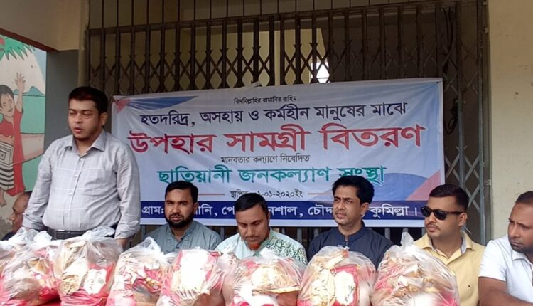 কুমিল্লার চৌদ্দগ্রামে পবিত্র ঈদুল ফিতর উপলক্ষে সামাজিক ও মানবিক সংগঠন ‘ছাতিয়ানী জনকল্যাণ সংস্থা’ এর উদ্যোগে হতদরিদ্র, অসহায় ও কর্মহীন ১৫০ পরিবারের মাঝে উপহার হিসেবে ঈদ সামগ্রী বিতরণ করা হয়েছে। এতে সেমাই, চিনি, নারিকেল, বাদাম, কিসমিস, শুকনা খেজুর, দুধ সহ নিত্য প্রয়োজনীয় খাদ্য সামগ্রী ছিলো। ঈদ উপলক্ষে সংস্থার পক্ষ থেকে উপহার হিসেবে খাদ্য সামগ্রী পেয়ে সংস্থার প্রতি কৃতজ্ঞতা প্রকাশ করেছেন উপকারভোগী সাধারণ মানুষ।
