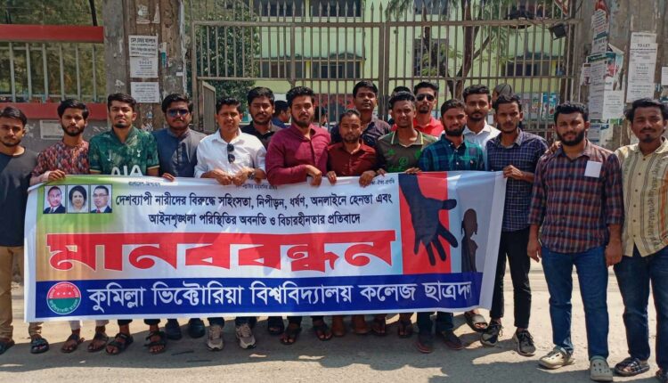 দেশব্যাপী অব্যাহত ধর্ষণ, নারী সহিংসতা, নিপীড়ন, অনলাইনে হেনস্তা, আইনশৃঙ্খলা পরিস্থিতির অবনতি ও বিচারহীনতার প্রতিবাদে মানববন্ধন করেছে কুমিল্লা ভিক্টোরিয়া সরকারি কলেজ ছাত্রদল। সোমবার কলেজের ডিগ্রি শাখায় এই মানববন্ধন অনুষ্ঠিত হয়।