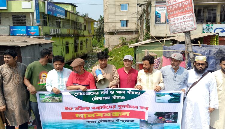 “চৌদ্দগ্রামের নদী ও খাল বাঁচাও, চৌদ্দগ্রাম বাঁচাও” শ্লোগানে এবং “ঈদ বঞ্চিত বন্যার্তদের পুনর্বাসন কর” দাবিতে বুধবার সকালে ঢাকা-চট্টগ্রাম মহাসড়কের ধোপাখাল(দখলে মৃত প্রায়) ব্রিজের উপরে মানববন্ধন অনুষ্ঠিত হয়। এতে উপজেলার বিভিন্ন স্বেচ্ছাসেবী সংগঠন, কবি, সাহত্যিক, ব্যবসায়ী, চাকুরিজীবী, শিক্ষক, সাংবাদিক ও ছাত্রসহ সর্বস্তরের মানুষ অংশগ্রহণ করেন। মানবন্ধনে বক্তারা চৌদ্দগ্রামের সবগুলো খাল, ডাকাতিয়া নদী ও কাকড়ি নদী অবৈধ দখল মুক্ত করা এবং অবৈধ কৃষিজমির মাটি কাটার বিরুদ্ধে ব্যবস্থা নিতে জোর দাবি জানান। গত বছরের ভয়াবহ বন্যায় ক্ষতিগ্রস্ত পরিবার গুলোকে পুর্নবাসনের জন্য প্রশাসন ও নদী-খাল, কৃষি, পরিবেশ, জীব বৈচিত্র্য রক্ষার্থে সর্বস্তরের মানুষকে এগিয়ে আসার আহ্বান জানান।