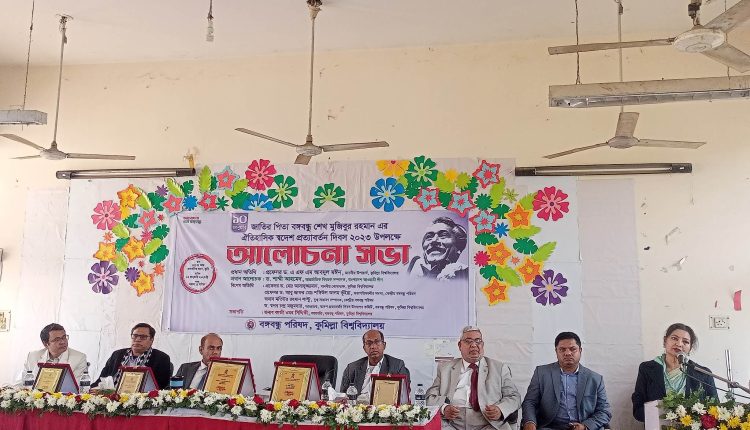 বঙ্গবন্ধু পরিষদের (একাংশ) সভাপতি কাজী ওমর সিদ্দিকীর সভাপতিত্বে অনুষ্ঠিত আলোচনা সভায় আরও উপস্থিত ছিলেন কোষাধ্যক্ষ অধ্যাপক ড. মো. আসাদুজ্জামান, কেন্দ্রীয় বঙ্গবন্ধু পরিষদের সভাপতি ম-লীর সদস্য অধ্যাপক ড. মো. আবু জাফর, যুগ্ম-সাধারণ সম্পাদক মতিউর রহমান লাল্টুসহ বিভিন্ন অনুষদের ডিন, হল প্রাধ্যক্ষ, শিক্ষক-শিক্ষার্থী ও শাখা ছাত্রলীগের নেতৃবৃন্দ।