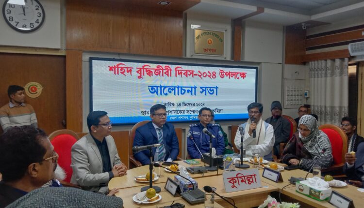 শহীদ বুদ্ধিজীবী দিবস উপলক্ষে কুমিল্লা জেলা প্রশাসন আয়োজিত আলোচনা সভায় বক্তারা বলেছেন, ১৯৭১ সালে বাংলাদেশকে মেধা শূন্য করার জন্য বুদ্ধিজীবীদের নির্মমভাবে হত্যা করা হয়েছে। মতান্তরে ২০০-৩০০ জনকে হত্যা করা হয়। এ ধরনের বিচার বহির্ভূত হত্যাকাণ্ড যেন এ দেশে আর না ঘটে সেজন্য আমাদের সোচ্চার থাকতে হবে।দেশের কল্যাণে কাজ করতে হবে। অতীত থেকে শিক্ষা নিয়ে যারা খারাপ তাদের বর্জন করতে হবে, যারা সঠিক তাদের মেনে নিব- এ প্রতিজ্ঞা থাকা প্রয়োজন। যারা বুদ্ধিজীবী, কবি, সাংবাদিক তাদের মুক্তমনে কথা বলার অধিকার নিশ্চিত করতে হবে। জেলা প্রশাসক মোঃ আমিরুল কায়ছারের সভাপতিত্বে এ সভা শনিবার জেলা প্রশাসকের সম্মেলন কক্ষে অনুষ্ঠিত হয়।