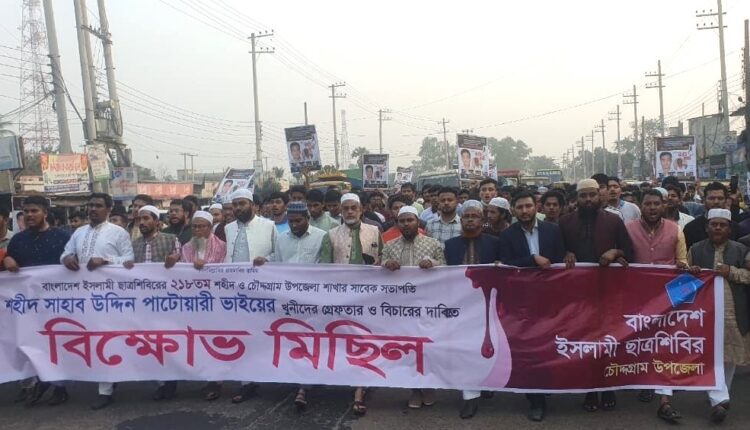 কুমিল্লার চৌদ্দগ্রাম উপজেলার সাবেক শিবির সভাপতি সাহাব উদ্দিন পাটোয়ারীর খুনিদের দ্রুত গ্রেফতার ও বিচার দাবিতে বিক্ষোভ মিছিলে করেছে উপজেলা ছাত্রশিবির। বৃহস্পতিবার বিকেলে মিছিলটি ঢাকা-চট্টগ্রাম মহাসড়কের চৌদ্দগ্রাম বাজার এলাকা প্রদক্ষিণ করে। এর আগে চৌদ্দগ্রাম নজমিয়া কামিল মাদ্রাসা মাঠে সমাবেশে প্রধান অতিথির বক্তব্য রাখেন উপজেলা জামায়াতের আমীর মাহফুজুর রহমান। কুমিল্লা দক্ষিণ জেলা শিবিরের সভাপতি মহিউদ্দিন রনির সভাপতিত্বে ও সেক্রেটারী জাহিদুল ইসলাম চৌধুরীর পরিচালনায় বিশেষ অতিথির বক্তব্য রাখেন পৌর জামায়াতের আমীর মুহাম্মদ ইব্রাহিম, নায়েবে আমীর কাজী এয়াছিন, সেক্রেটারী মোশারফ হোসেন ওপেল, শহীদ সাহাব উদ্দিনের পিতা জয়নাল পাটোয়ারী, কুমিল্লা দক্ষিণ জেলা শিবিরের সাবেক সভাপতি আবদুর রব ফারুকী, জেলা পূর্বের সাবেক সভাপতি ইব্রাহিম ফয়সাল, সাবেক সেক্রেটারী ফরিদুজ্জামান রুবেল, অফিস সম্পাদক মোশারফ হোসাইন, উপজেলা ছাত্রশিবিরের সাবেক সভাপতি আল আমিন রাসেল, রবিউল হোসেন মিলন, মাঈন উদ্দিন, কফিল উদ্দিন, জোবায়ের মাসুম, উপজেলা শিবিরের সভাপতি মোজাম্মেল হক, জেলা শিবিরের সাবেক অফিস সম্পাদক রবিউল করিম মজুমদার শামীম, সাবেক সাহিত্য সম্পাদক বোরহান উদ্দিন। এ সময় বিভিন্ন এলাকা থেকে আগত শিবিরের নেতাকর্মীরা উপস্থিত ছিলেন।