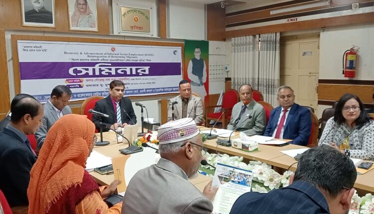 বিশ্বের ১৭৮টি দেশে কাজ করেন দেড় কোটি বাংলাদেশী। এদিকে ২০১৫সাল থেকে কাজ হারিয়ে দেশে ফিরেছেন ৫ লক্ষ প্রবাসী। তাদের মধ্যে ২লক্ষ প্রবাসী প্রশিক্ষণসহ াবাভন্ন প্রণোদনা পাচ্ছেন। বাকিদেরও প্রণোদনার আওতায় আনার জন্য কাজ করছে প্রবাসী কল্যাণ ও বৈদেশিক কর্মসংস্থান মন্ত্রণালয়। বিদেশ প্রত্যাগত অভিবাসী কর্মীদের পুনঃএকত্রীকরণে রেইজ প্রকল্পের ভূমিকা শীর্ষক সেমিনারে এই তথ্য জানানো হয়। মঙ্গলবার কুমিল্লা জেলা প্রশাসকের সম্মেলন কক্ষে এই সেমিনার অনুষ্ঠিত হয়। জেলা প্রশাসক খন্দকার মু. মুশফিকুর রহমানের সভাপতিত্বে এতে প্রধান অতিথি ছিলেন রেইজ প্রকল্পের প্রকল্প পরিচালক যুগ্ম সচিব সৌরেন্দ্র নাথ সাহা। ওয়েলফেয়ার সেন্টার কুমিল্লার উদ্যোগে আয়োজিত এ সেমিনারে শুভেচ্ছা বক্তব্য রাখেন ওয়েলেফেয়ার সেন্টার কুমিল্লার সহকারী পরিচালক মোঃ আলী হোসেন। সেমিনারে মূল প্রবন্ধ উপস্থাপন করেন ওয়েজ আর্নার্স কল্যাণ বোর্ডের প্রতিনিধি মো. আসাদুল ইসলাম।