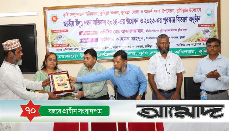 ইঁদুর দমনে কৃষক, সরকারি প্রতিষ্ঠান, উপসহকারী কৃষি কর্মকর্তা এবং উপজেলা কৃষি কর্মকর্তা পর্যায়ে পুরষ্কার প্রদান করা হয়। কৃষি সম্প্রসারণ অধিদপ্তর(ডিএই), কুমিল্লা অঞ্চল, কুমিল্লা জেলা ও আদর্শ সদর উপজেলা কুমিল্লার উদ্যোগে এই আয়োজন করা হয়। ডিএই কুমিল্লার উপপরিচালকের প্রশিক্ষণ হলে জাতীয় ইঁদুর দমন অভিযান ২০২৪ উদ্বোধন ও ২০২৩-এর পুরস্কার বিতরণ করা হয়। অনুষ্ঠানে প্রধান অতিথির বক্তব্য রাখেন, ডিএই কুমিল্লা অঞ্চলের অতিরিক্ত পরিচালক কৃষিবিদ মোঃ আক্তারুজ্জামান।