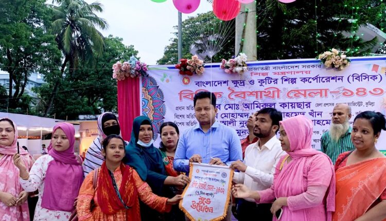 বাংলাদেশ ক্ষুদ্র ও কুটির শিল্প কর্পোরেশনের (বিসিক) উদ্যোগে বিসিক বৈশাখীমেলার উদ্বোধন করা হয়েছে। বৃহস্পতিবার (১৭এপ্রিল) বিকালে কুমিল্লা স্টেশন ক্লাব প্রাঙ্গণে এই মেলা বসে। ৫০টি স্টলে জামদানি, বাঁশবেত, খাদি, মৃৎশিল্প, নকশীকাঁথা,পিঠাসহ হাতে তৈরি নানান পণ্যের সমাহার ঘটে। উদ্যোক্তাদের অধিকাংশ নারী। অনুষ্ঠানে জানানো হয়, কুমিল্লা বিসিকে উৎপাদিত মাছ ধরার জাল দেশের ৫০ভাগ চাহিদা পূরণ করছে। এদিকে হাতে তৈরি বিভিন্ন পণ্য কিনে খুশি বলে জানান ক্রেতারা। বেলুন উড়িয়ে মেলার উদ্বোধন করেন কুমিল্লার অতিরিক্ত জেলা প্রশাসক (শিক্ষা ও আইসিটি) মো. তৌহিদুল ইসলাম। উদ্বোধনী অনুষ্ঠানে সভাপতিত্ব করেন বিসিক কুমিল্লার ডিজিএম মো. মুনতাসীর মামুন। বিশেষ অতিথি ছিলেন জেলা সিভিল সার্জন ডাঃ আলী নুর মোহাম্মদ বশীর আহমেদ, বিসিক উপব্যবস্থাপক আবদুল্লাহ আল মাসুম। প্রমোশন কর্মকর্তা মো. নাজমুল হাসানের সঞ্চালনায় বক্তব্য রাখেন উদ্যোক্তা ইয়াসমিন আক্তারসহ অন্যান্যরা।