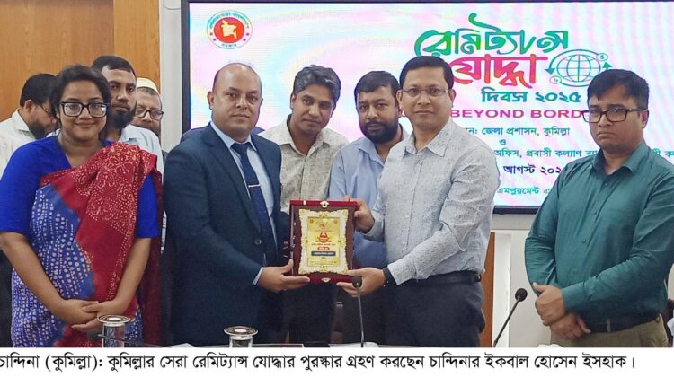 কুমিল্লা জেলার সর্বোচ্চ রেমিট্যান্স প্রেরণকারী যোদ্ধা হিসেবে নির্বাচিত হয়েছেন মালয়েশিয়া প্রবাসী ইকবাল হোসেন ইসহাক। অগ্রণী ব্যাংক চান্দিনা শাখার মাধ্যমে দেশে সর্বোচ্চ রেমিট্যান্স পাঠিয়ে কুমিল্লা জেলার দ্বিতীয় রেমিট্যান্স যোদ্ধা হয়েছেন তিনি।