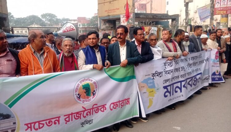কুমিল্লা বিমান বন্দর চালু, কুমিল্লা নামে বিভাগ ষোষণা ও ঢাকা-কুমিল্লা সরাসরি রেললাইন প্রতিস্থাপনের দাবিতে মানববন্ধন কর্মসূচি পালন করা হয়েছে। বুধবার বিকেলে কুমিল্লা টাউন হলের সামনে এ কর্মসূচি পালন করা হয়।