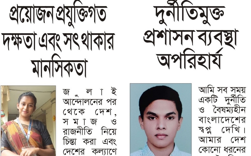 জুলাই আন্দোলনের পর থেকে দেশ, সমাজ ও রাজনীতি নিয়ে চিন্তা করা এবং দেশের কল্যাণে অংশীদার হওয়ার বিষয়গুলো আমাকে প্রবলভাবে আকৃষ্ট করেছে। আমরা প্রত্যেক মানুষই এক একজন নির্মাতা। আমরা যেমন চাইব, আমাদের বাংলাদেশকে সেভাবেই গড়ে তুলতে পারব। আমাদের প্রত্যেকের অন্তরে একটি করে দেশপ্রেমিক সত্বা লুকিয়ে আছে। ভবিষ্যতের বাংলাদেশকে যেন আমরা বিশ্ব দরবারে উপস্থাপন করতে পারি, তার জন্য সবচেয়ে বেশি প্রয়োজন প্রযুক্তিগত দক্ষতা এবং সৎ পথে থাকার মানসিকতা। কারণ আমাদের দেশের দুর্নীতির অবস্থা অত্যন্ত নাজুক, পাশাপাশি প্রযুক্তিগতভাবে দক্ষ মানুষের সংখ্যাও সীমিত। এর পাশাপাশি আরেকটি বিষয় হলো,আমাদের সমাজে বেশিরভাগ মেয়েরা রাজনীতি ও সামাজিক বিষয়ে এখনো উদাসীন। এই উদাসীনতা থেকে আমাদের বেরিয়ে আসতে হবে। কারণ, যদি আমরা নিজ দায়িত্বে নিষ্ঠার সঙ্গে শ্রম ও মেধা কাজে লাগাই, তবে আমাদের আগামীর পথ আরও সুগম হবে। আর আমরা আমাদের স্বপ্নের বৈষম্যহীন বাংলাদেশ নির্মাণ করতে সক্ষম হবো।