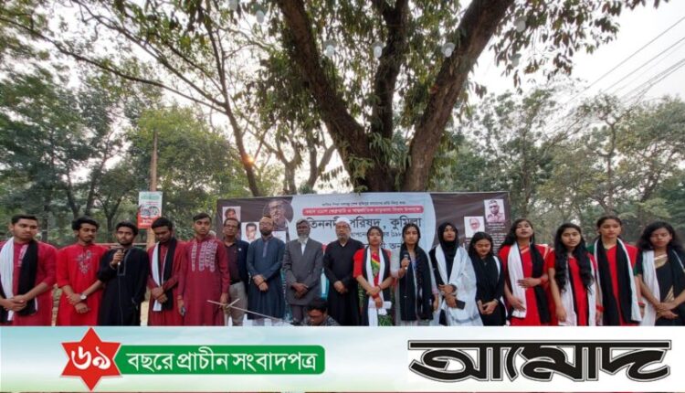 মহান ২১শে ফেব্রুয়ারি ও আন্তর্জাতিক মাতৃভাষা দিবস উপলক্ষে তিননদী পরিষদের ২১ দিন ব্যাপী অনুষ্ঠানমালার ২০ তম দিনে জামতলায় অবস্থিত মুক্তমঞ্চের অনুস্ঠানে অংশগ্রহণ করে কুমিল্লার ঐতিহ্যবাহী শিক্ষা প্রতিষ্ঠান ভাষা সৈনিক অজিত গুহ মহাবিদ্যালয়। তিননদী পরিষদের সভাপতি সাপ্তাহিক অভিবাদন সম্পাদক আবুল হাসনাত বাবুলে সভাপতিত্বে প্রধান অতিথি ছিলেন বিশিষ্ট শিক্ষাবিদ ও সংগঠক, ভাষা সৈনিক অজিত গুহ মহাবিদ্যালয়ের অধ্যক্ষ মোঃ শরিফুল ইসলাম। বিশেষ অতিথির বক্তব্য রাখেন বিশিষ্ট লেখক ও গবেষক উপাধ্যক্ষ মোঃ মোস্তাক আহমদ। রাহুল তারণ পিন্টুর সঞ্চালনায় আরো বক্তব্য রাখেন সাংবাদিক অশোক বড়ুয়া। সাংস্কৃতিক পর্বে মনোজ্ঞ সাংস্কৃতিক অনুষ্ঠান উপহার দেয় ভাষা সৈনিক অজিত গুহ মহাবিদ্যালয়ের থিয়েটার গ্রুপ ও সাংস্কৃতিক ক্লাব। কলেজের শিক্ষকরা, কর্মকর্তা, কর্মচারী, রোভার স্কাউট , বিএনসিসিসহ শিক্ষার্থীদের উপস্থিতি অনুষ্ঠানকে আরো বেশি প্রাণবন্ত করে তোলে।-প্রেস বিজ্ঞপ্তি।