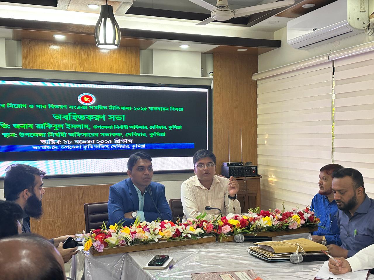 “সার ডিলার নিয়োগ ও সার বিতরণ সংক্রান্ত সমন্বিত নীতিমালা- ২০২৫”” এর বিষয়ে অবহিতকরণ সভা  মঙ্গলবার দেবিদ্বার উপজেলার উপজেলা নির্বাহী অফিসারের কনফারেন্স রুমে অনুষ্ঠিত হয়েছে। উপজেলা সার ও বীজ মনিটরিং কমিটির সদস্য সচিব ও উপজেলা কৃষি অফিসার কৃষিবিদ বানিন রায়ের সঞ্চালনায় উক্ত অবহিতকরণ সভায় সভাপতিত্ব করেন উপজেলা সার ও বীজ মনিটরিং কমিটির সভাপতি ও উপজেলা নির্বাহী অফিসার রাকিবুল ইসলাম। উক্ত সভায় দেবিদ্বার উপজেলার সকল বিসি আই সি, বিএডিসি, খুচরা সার বিক্রেতা, উপসহকারি কৃষি অফিসার ও উপজেলা সার ও বীজ মনিটরিং কমিটির সদস্যরা উপস্থিত ছিলেন।