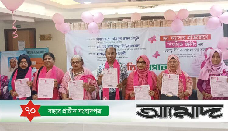 নারীদের প্রতি ৮জনের একজন স্তন ক্যান্সারের ঝুঁকিতে রয়েছেন। প্রতিবছর স্তন ক্যান্সারে বাংলাদেশে ১২হাজার ৬৬৪জন নারী আক্রান্ত হচ্ছেন। মৃত্যু হচ্ছে ৭হাজার ১৩৫জনের। এদিকে যে নারী সন্তানকে বুকের দুধ পান করান না,নি:সন্তান তারা ক্যান্সারের ঝুঁকিতে বেশি থাকেন। ৩৫বছরের বেশি বয়সের নারীদের প্রতি বছর একবার স্তন পরীক্ষা করানো প্রয়োজন। এতে সমস্যা প্রথমদিকে শনাক্ত হলে তা নিরুপণ সহজ হয়। তাই লজ্জা না করে চিকিৎসা নিতে হবে। স্তন ক্যান্সার প্রতিরোধে নিয়মিত স্ক্রিনিংয়ের গুরুত্ব শীর্ষক আলোচনা সভায় বক্তারা এই তথ্য জানান। শুক্রবার কুমিল্লা নগরীর গোমতী হাসপাতালের মিলনায়তনে এই সভার আয়োজন করা হয়। সহযোগিতায় ছিলো নারী উদ্যোগ কেন্দ্রের উইমেন্স ক্যান্সার কন্ট্রোল প্রোগ্রাম।