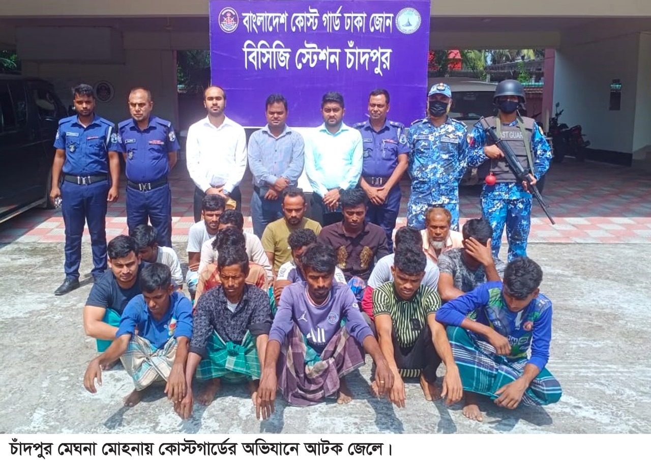 চাঁদপুরে মেঘনা নদীর মোহনায় অবৈধ কারেন্ট জাল, দুটি মাছ ধরার নৌকাসহ ১৭ জন জেলেকে আটক করেছে কোস্ট গার্ড।