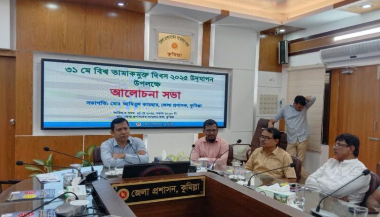 বিশ্ব তামাকমুক্ত দিবস উপলক্ষে জেলা প্রশাসন আয়োজিত আলোচনাসভায় বক্তারা বলেছেন, প্রতি বছর ৭০ লাখ মানুষ তামাক সেবনের ফলশ্রুতিতে মারা যায়। পরোক্ষ ধূমপানের শিকার শিশুরা ৫০-১০০% অধিক তীব্র শ্বাসযন্ত্রের অসুস্থতার ঝুঁকিতে রয়েছে। সরাসরি তামাক সেবন না করেও প্রতি বছর মারা যাচ্ছে ১২ লাখ মানুষ। পরোক্ষ ধূমপানের শিকার হচ্ছে ধূমপায়ীর সহকর্মী, পরিবার ও সমাজের সকলে। শনিবার জেলা প্রশাসকের সম্মেলন কক্ষে এ সভা অনুষ্ঠিত হয়।
