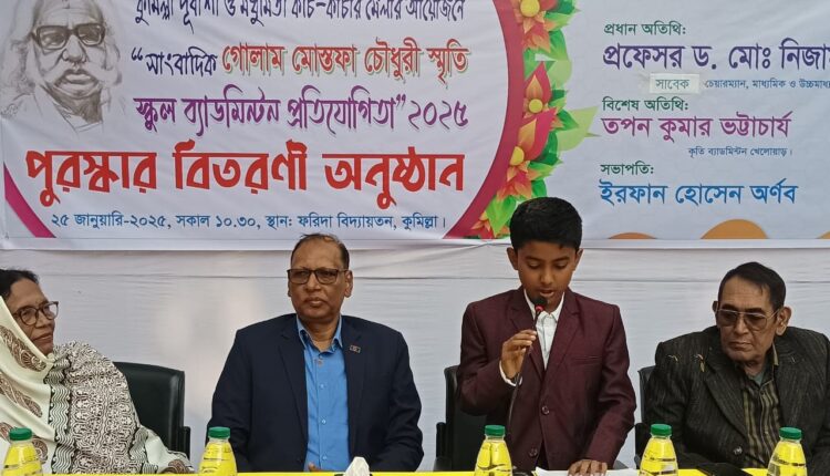কুমিল্লা পূর্বাশা ও মধুমিতা কচি-কাঁচার মেলার আয়োজনে বরেণ্য প্রয়াত সাংবাদিক গোলাম মোস্তফা চৌধুরী স্মৃতি স্কুল ব্যাডমিন্টন প্রতিযোগিতার পুরস্কার বিতরণ শনিবার অনুষ্ঠিত হয়েছে। কুমিল্লা নগরীর ফরিদা বিদ্যায়তন মাঠে এই আয়োজন করা হয়। এতে প্রধান অতিথি ছিলেন কুমিল্লা শিক্ষাবোর্ডের সদ্য সাবেক চেয়ারম্যান ড. নিজামুল করিম। সভাপতিত্ব করেন কুমিল্লা মডার্ন স্কুলের ৩য় শ্রেণীর শিক্ষার্থী ইরফান হোসেন অর্ণব। বিশেষ অতিথি ছিলেন সাবেক কৃতী ব্যাডমিন্টন খেলোয়াড় তপন ভট্টাচার্য। বক্তব্য রাখেন টুর্নামেন্ট কমিটির চেয়ারম্যান অনিমা মজুমদার, কো-চেয়ারম্যান বদরুল হুদা জেনু,কুমিল্লা নওয়াব ফয়জুন্নেছা বালিকা উচ্চ বিদ্যালয়ের প্রধান শিক্ষক রাশেদা আক্তার, কুমিল্লা প্রেসক্লাবের সাধারণ সম্পাদক জাহিদ হাসান ও সাংবাদিক গোলাম মোস্তফা চৌধুরীর ছেলে জুনাইদ মোস্তফা প্রমুখ।