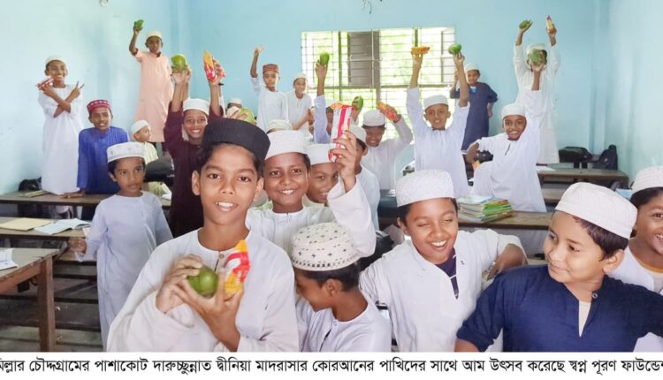 কুমিল্লার চৌদ্দগ্রাম উপজেলার শুভপুর ইউনিয়নের পাশাকোট দারুচ্ছুন্নাত দ্বীনিয়া মাদরাসার ৬০০ ও চিওড়া ইউনিয়নের পূর্ব ডিমাতলী জামিয়া ইমদাদিয়া জুলফিকার হায়দার কারিমীয়া মাদরাসার ২০০ শিক্ষার্থীর সাথে আম উৎসব করেছে স্বপ্ন পূরণ ফাউন্ডেশন। বৃহস্পতিবার পাশাকোট দারুচ্ছুন্নাত দ্বীনিয়া মাদরাসার শিশু থেকে দশম শ্রেণী পর্যন্ত শ্রেণীকক্ষে হেফজ বিভাগ, নুরানী বিভাগ, দ্বীনিয়া শাখার প্রত্যেক শিক্ষার্থীকে একটি আম রুপালি এবং এক প্যাকেট বিস্কুট বিতরণ করেন স্বপ্ন পূরণ ফাউন্ডেশনের প্রতিষ্ঠাতা পরিচালক মোঃ মোশাররফ হোসেন। এ সময় উপস্থিত ছিলেন বিশিষ্ট ব্যাংকার ও স্বপ্ন পূরণ ফাউন্ডেশনের পরিচালক মনির হোসেন খোকন, জাহাঙ্গীর আলম সাহেদ ফাউন্ডেশনের প্রতিষ্ঠাতা আবুল কালাম আজাদ রাসেল, চৌদ্দগ্রাম প্রেস ক্লাবের সিনিয়র সহ-সভাপতি মোঃ এমদাদ উল্যাহ, চিওড়া ইউনিয়ন ব্লাড ডোনেশনের প্রতিষ্ঠাতা মোহাম্মদ হোসেন নয়ন, উপদেষ্টা মোঃ আবুল হাশেম, স্বপ্ন পূরণ ফাউন্ডেশনের সদস্য মোঃ হাসান, তানভীর হোসেন, সোহাগ মোর্শেদ চৌধুরী, আলোকচিত্রী সাকিবুল হাসান মিয়াজীসহ মাদরাসার শিক্ষকবৃন্দ। এছাড়া পূর্ব ডিমাতলী মাদরাসার ছাত্রদের মাঝেও আম এবং বিস্কুট বিতরণ করা হয়।