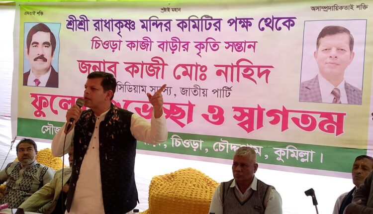 জাতীয় পার্টি ( কাজী জাফর) প্রেসিডিয়াম সদস্য কাজী নাহিদ বলেন – আমরা সকলেই মানুষ। কিছু মানুষের মাঝে সংখ্যালঘু শব্দটি থাকতে পারে না।। আপনাদের অর্থাৎ সকলের নিরাপত্তা ও মৌলিক অধিকার নিশ্চিত করা হবেই আমার প্রধান লক্ষ্য।। আমি আপনাদের আশীর্বাদ কামনা করি । আমাদের পূর্বপুরুষেরা এবং আমার প্রিয় চাচা সাবেক প্রধানমন্ত্রী কাজী জাফর আহমদের মাঝে কখনোই বৈষম্যের ছোঁয়া লাগেনি। সাবেক প্রধানমন্ত্রী কাজী জাফর আহমেদ আপনাদের মুরুব্বিদের সাথে সব সময় যোগাযোগ রাখতেন, খোঁজখবর নিতেন। আমরা তার ভাতিজা; আজকে আপনাদের শ্রীশ্রী রাধাকৃষ্ণ ও চিওড়া শিল বাড়ির গীতাযোগ্য অনুষ্ঠানে উপস্থিত হতে পেরে আনন্দিত। কাজী জাফর আহমেদ প্রধানমন্ত্রী থাকাকালীন সনাতন ধর্মের থেকে তিনি মন্ত্রী বানিয়েছেন। চৌদ্দগ্রামে কাজী জাফর আহমদের শ্লোগান চৌদ্দগ্রামের জনতা গড়ে তোলো একতা; সেখানে কোন ধর্ম নেই দল মত নেই; একচিত্তে এক সাথে কাজ করেছিলাম। এবং সেই শ্লোগানকে সামনে নিয়ে আমি চৌদ্দগ্রামে প্রত্যেক জায়গায় গিয়ে প্রতিটি মানুষকে বুঝানোর চেষ্টা করছি। চৌদ্দগ্রামে যেন কাউকে কেউ হেয় প্রতিপন্ন করতে না পারে। সেই ধরনের রাজনৈতিক চর্চা করবো।  আমি সবাইকে নিয়ে চৌদ্দগ্রামকে একটি সাজানো বাগানে রূপান্তর করবো।