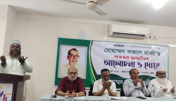 সংবাদপত্র প্রকাশের মাধ্যমে মোহাম্মদ ফজলে রাব্বী একটি মননশীল সমাজ বিনির্মাণে কাজ করে গেছেন। আজ থেকে ৭১বছর আগে তিনি কুমিল্লার মতো মফম্বল শহরে সংবাদপত্র প্রকাশ করেছেন। তাও ক্রীড়া বিষয়ক সংবাদপত্র। সে সময় শহরে তেমন পাঠক ও বিজ্ঞাপনদাতা ছিলো না। সেই সময়ে এ যাত্রাকে দুঃসাহিক বলা যেতে পারে। তিনি সমাজের কল্যাণে কাজ করেছেন বলে মৃত্যুর ৩২বছর পরেও মানুষ তাকে স্মরণ করছে। হদয় উজাড় করে সমাজকে ভালোবাসলে তাদের মানুষ যুগে যুগে স্মরণ করেন। প্রাচীন সংবাদপত্র আমোদ-এর প্রতিষ্ঠাতা সম্পাদক মোহাম্মদ ফজলে রাব্বীর শততম জন্মদিন উপলক্ষে আয়োজিত আলোচনা সভা ও দোয়ার অনুষ্ঠানে বক্তারা এসব কথা বলেন। রবিবার কুমিল্লা নগরীর বাগিচাগাঁও এলাকার আইডিয়াল কলেজ মিলনায়তনে মোহাম্মদ ফজলে রাব্বী সংসদ এই অনুষ্ঠানের আয়োজন করে। এতে সভাপতিত্ব করেন সংসদের সভাপতি খায়রুল আহসান মানিক। বক্তব্য রাখেন কুমিল্লা মেডিকেল কলেজের সাবেক অধ্যক্ষ ডা. মোসলেহ উদ্দিন আহমেদ, সংসদের সাবেক সভাপতি আবুল হাসানাত বাবুল,শাহ মোহাম্মদ আলমগীর খান,বিএমএ কুমিল্লার সাবেক সভাপতি ডা. ইকবাল আনোয়ার,নাট্য অভিনেতা শাহজাহান চৌধুরী, মোহাম্মদ ফজলে রাব্বীর ছেলে আমোদ সম্পাদক বাকীন রাব্বী। সঞ্চালনা করেন সংসদের সহ-সভাপতি শাহাজাদা এমরান। স্বাগত বক্তব্য রাখেন সংসদের সাধারণ সম্পাদক সাইয়িদ মাহমুদ পারভেজ। দোয়া পরিচালনা করেন দক্ষিণ জেলা ইমাম সভাপতির সাধারণ সম্পাদক মাওলানা আবু হানিফ মজুমদার।