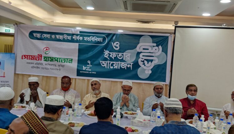 কুমিল্লা গোমতী হাসপাতালে স্বাস্থ্য সেবা- স্বাস্থ্যবীমা শীর্ষক মতবিনিময় সভা ও ইফতার মাহফিল অনুষ্ঠিত হয়েছে। ৮ মার্চ (শনিবার) বিকালে গোমতী হাসপাতালের মিলনায়তনে মতবিনিময় সভায় মূল আলোচক ছিলেন হাসপাতালের প্রধান নির্বাহী পরিচালক ডা. মো.মুজিবুর রহমান। অনুষ্ঠানে বক্তব্য রাখেন কুমিল্লা সরকারি মহিলা কলেজের অধ্যক্ষ হাসনাত আনোয়ার উদ্দিন, নিউরোলজি বিশেষজ্ঞ ডা: নাজমুল হাসান, অর্থোপেডিক্স বিশেষজ্ঞ ডা: খালিদ হোসেন,কুমিল্লা আইনজীবী সমিতির সভাপতি অ্যাডভোকেট সহিদ উল্লাহ, সমবায় ব্যাংক কুমিল্লার চেয়ারম্যান অ্যাডভোকেট কাজী নাজমুস সাদাত,ডা: নিলুফা পারভীন, ডা: ইমাম উদ্দিন, কুমিল্লা রেসিডেন্সিয়াল কলেজের অধ্যক্ষ আবদুল হান্নান,ডা: ইরফানুল হক মিশু,হাসপাতালের কর্মকর্তা মিয়া মো: তৌফিক, আবু নোমান। ইফতার আয়োজনে চিকিৎসক,সাংবাদিকসহ বিভিন্ন পেশার লোকজন উপস্থিত ছিলেন।– প্রেস বিজ্ঞপ্তি।