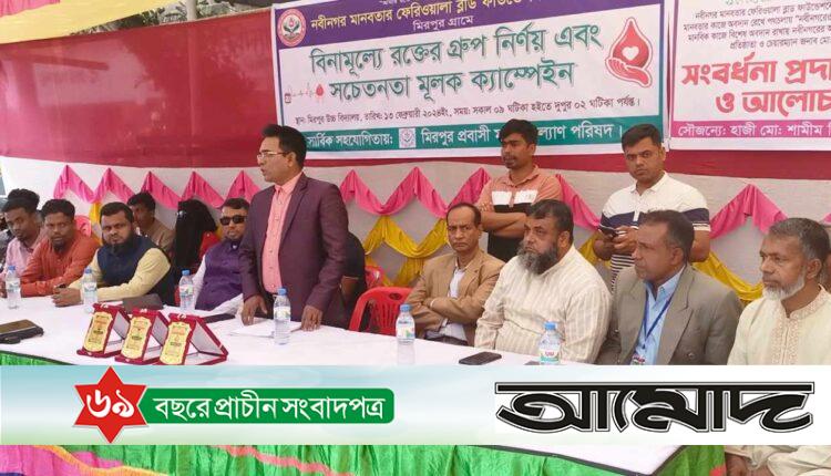 আমার রক্তে বাঁচলে প্রাণ, স্বেচ্ছায় করবো রক্তদান ,এই শ্লোগান কে সামনে, ব্রাহ্মণবাড়িয়া নবীনগর উপজেলা শিবপুর ইউনিয়ন মিরপুর উচ্চ বিদ্যালয় মাঠে মঙ্গলবার দুপুরে, নবীনগরের আঞ্চলিক কথা মানুষের কল্যাণে গ্রুপের প্রতিষ্ঠাতা ও চেয়ারম্যান মোঃ রানা জালাল মুন্সিকে সংবর্ধনা প্রদান ও নবীনগর মানবতার ফেরিওয়ালা ব্লাড ফাউন্ডেশনের উদ্যোগে বিনামূল্যে রক্তের গ্রুপ নির্ণয় এবং সচেতনতা মূলক ক্যাম্পেইন ও আলোচনা সভা অনুষ্ঠিত হয়েছে । নবীনগর মানবতার ফেরিওয়ালা ব্লাড ফাউন্ডেশনের ১০০ ব্যাগ ব্লাড ডোনেশন করায় মানবতার কাজে অবদান রেখে পথচলায় মোঃ রানা জালাল মুন্সিকে সংবর্ধনা প্রদান করেন মিরপুর প্রবাসী মানব কল্যাণ পরিষদ। এতে বক্তব্য রাখেন, মিরপুর উচ্চ বিদ্যালয়ের প্রধান শিক্ষক আজহারুল হক , সহকারী প্রধান শিক্ষক শাহাদাত হোসেন, মিরপুর প্রবাসী মানব কল্যাণ পরিষদের প্রতিষ্ঠাতা ও প্রধান উপদেষ্টা জয়দীল হোসেন , উপদেষ্টা হাজী শামসুল হক, কোষাধ্যক্ষ মুখলেসুর রহমান , সাংগঠনিক সম্পাদক আইনাল হক , সাইদুল আলম সবুজসহ আরো অনেকেই ।