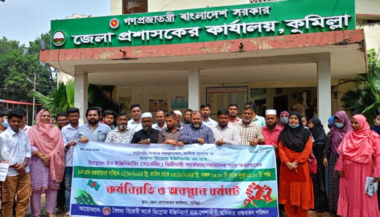 কুমিল্লা জেলা প্রশাসক কার্যালয়ের সামনে অবস্থান কর্মসূচি করেছে সার্ভে ডিপ্লোমাধারীরা। বুধবার তারা এই কর্মসূচি পালন করেন। বৈষম্য বিরোধী সার্ভে ডিপ্লোমা ইঞ্জিনিয়ার্স ছাত্র, পেশাজীবী অধিকার বাস্তবায়ন পরিষদের উদ্যোগে বুধবার ২য় দিনের মতো এ অবস্থান কর্মসূচি অনুষ্ঠিত হয়। এতে অংশ নেন কুমিল্লা জেলার বিভিন্ন উপজেলার সার্ভেয়ার ও সার্ভে ইনস্টিটিউটের শিক্ষার্থীরা। উপস্থিত ছিলেন, চট্টগ্রাম বিভাগীয় সমন্বয়ক কবির আহমেদ, সেটেলমেন্ট সার্ভে সমিতির কুমিল্লা জেলা সভাপতি আব্দুল খালেক, সেটেলমেন্ট সার্ভে সমিতির সেক্রেটারি হেলাল উদ্দিন, বরুড়া উপজেলা সার্ভেয়ার রাসেল মাহমুদ মজুমদার, চৌদ্দগ্রাম উপজেলা সার্ভেয়ার মিজানুর রহমানসহ সার্ভে ডিপ্লোমা ইঞ্জিনিয়ার্স শিক্ষার্থীরা।